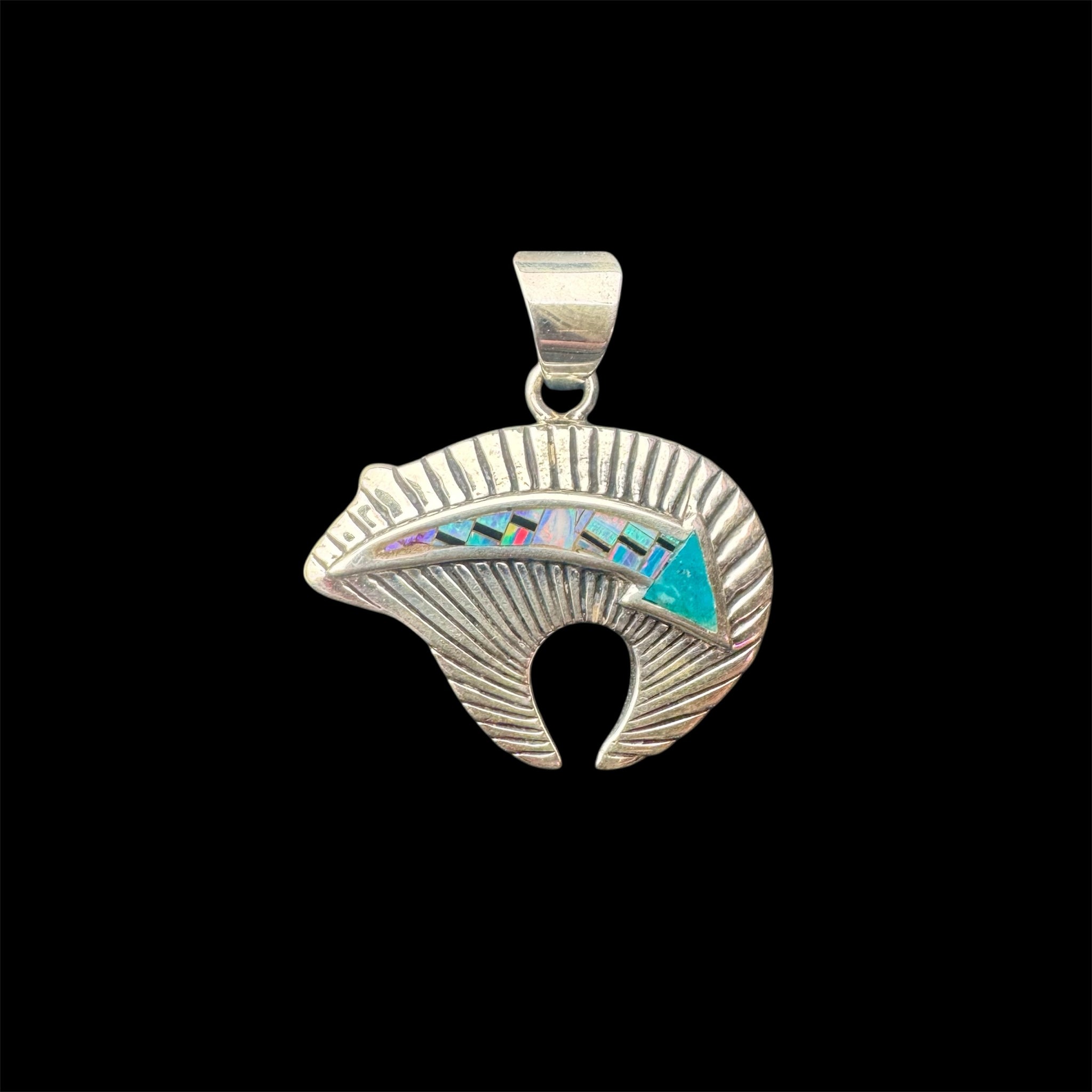 Gorgeous Zuni bear shaped inlay pendant from the Stardust Collection featuring turquoise, lab opal, sugilite and black jade.