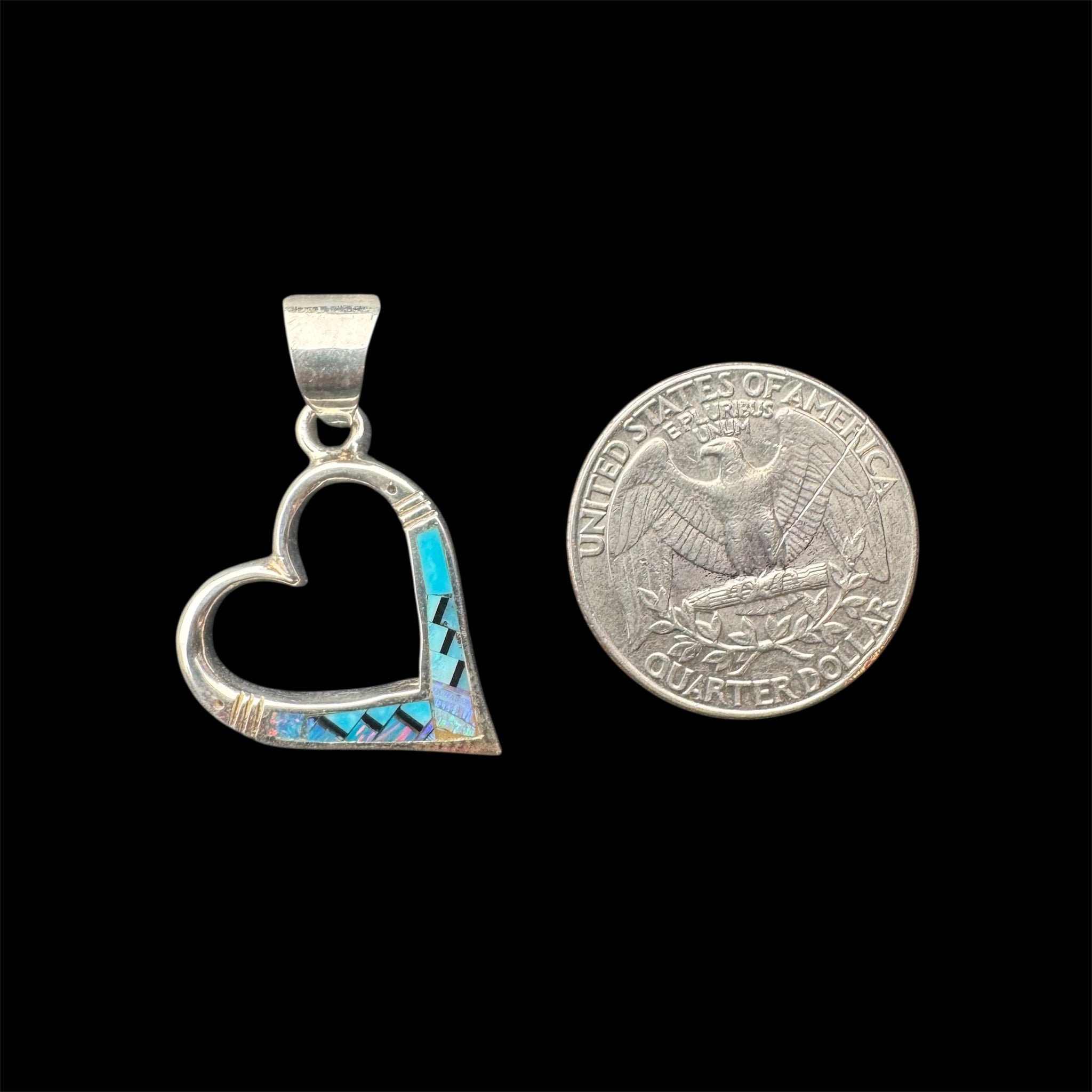 Gorgeous heart shaped inlay pendant from the Stardust Collection featuring turquoise, lab opal, sugilite and black jade.