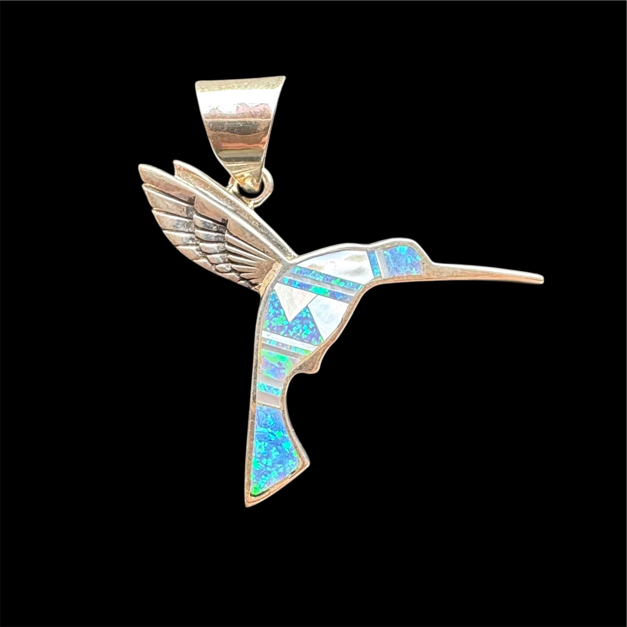 Gorgeous hummingbird shaped inlay pendant from the Mystic Pearl Collection featuring mother of pearl and lab opal.
